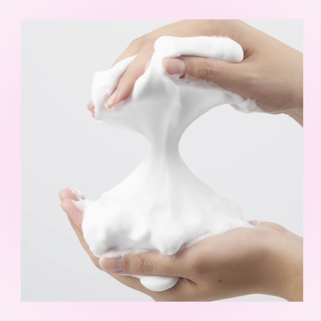 濡らした顔にピンポン玉大の泡をのせ、泡を転がすようにやさしく広げます。泡で包み込むようにこすらずに洗い、その後ぬるま湯でよく洗い流してください。
