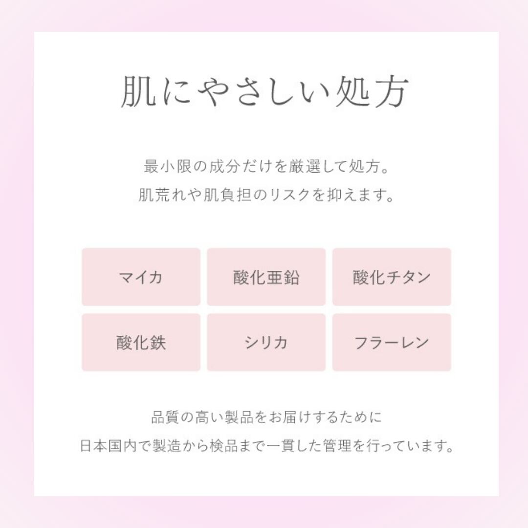 4つの厳選したミネラル成分だけでできたシンプル処方。負担を感じない軽やかでやさしい付け心地。気になる肌悩みをカバーして、きめ細かな肌に仕上げます。